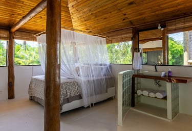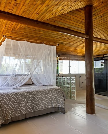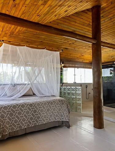 Relaxe em quartos espaçosos com tetos de madeira tropical, salas de estar arejadas e mobiliário confortável, projetados para uma estadia tranquila.