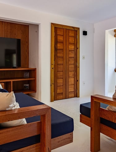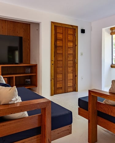 Relax in spacious bedrooms with tropical wooden ceilings, airy living spaces and comfortable furnishings designed for a peaceful stay.
